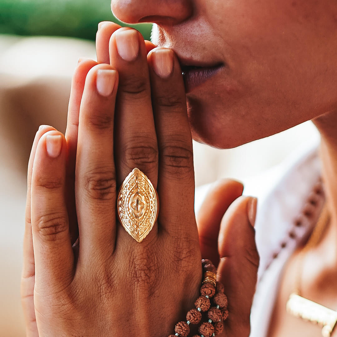 The Dalaja Ring, beautifully crafted in a petal shape, inspired by energy petals that hold ‘bijas’, the power sounds of creation. The Maha Mantra Om Namah Shivaya, a sacred combination of bijas, is inscribed on the inside of the ring’s surface. Shiva is the embodiment of supreme consciousness and it is through Shiva’s energy and prayer that we gain great protection and increase our soul power. Shiva is also known to the divine gift-giver, he blesses all who come to him with an open heart. Our beautiful Dalaja ring has been activated and blessed to bless you with the fulfillment of your heart’s desire.