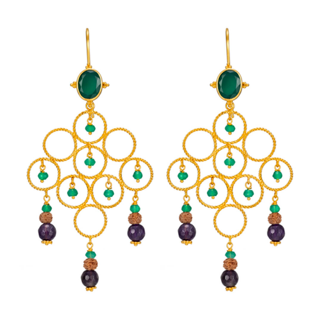 These beautiful earrings, made with sterling silver and plated in lustrous 22 carat gold, feature a stunning combination of 8 x 10mm faceted green agate oval gemstones and a gorgeous dangling display of 4mm rudraksha, green agate and faceted amethyst beads. This auspicious combination amplifies the power of Lakshmi within – radiating from you during meditation sessions, yoga practices and in everything you do. Allow this divine energy to guide you with greater confidence and competence towards experiencing true abundance in all aspects of life.