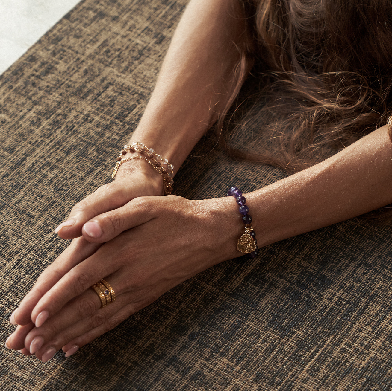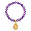 8mm faceted amethyst, 22k gold vermeil Durga pendant, strung on elastic thread