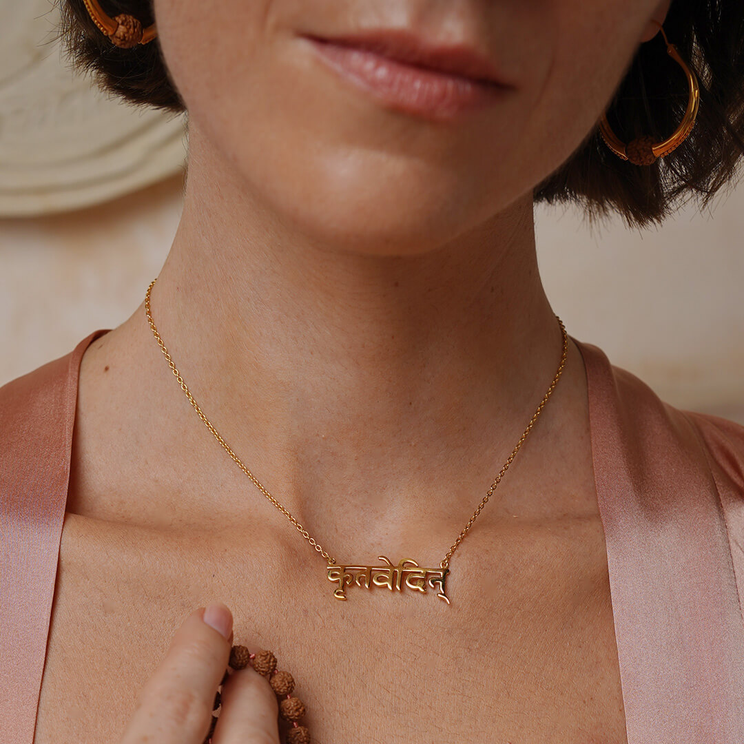 The ‘Grateful’ Sanskrit Mantra Necklace is an embodiment of this sublime expression. Gratitude, after all, is not just a fleeting emotion. It’s a personal truth, a perspective that sees life as a gift teeming with endless possibilities that inspire thankfulness. Gratitude does not just imply greatness, it creates it. Crafted with the Sanskrit word for ‘Grateful’, this delicate necklace serves as a daily reminder of the importance of gratitude in our quest for true happiness. Every time you look at it, you’ll be reminded to appreciate the beauty of life’s gifts, to open your heart to others, and to embrace the greatness that gratitude brings. Say it with love. Say it with power. Say it in Sanskrit.