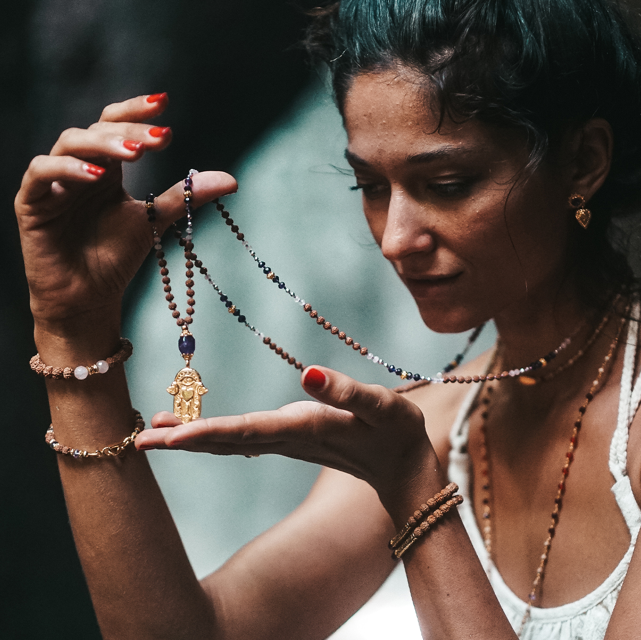 “Love mine. I could feel the energy the minute I put it on. It’s long enough to double up when I wear it everyday. Considering getting one for my daughter now too.”- Joya, SHIVALOKA customer “Gorgeous piece! I wear it to yoga and get endless (literally daily) compliments – I guess that’s what happens when you wear the necklace promoting an open heart :).” – Ashley, SHIVALOKA customer “I received the Hamsa Friendship Mala as a gift from a dear friend. It’s more than just a piece of jewelry; it’s a symbol of our bond, a reminder of our shared experiences. Every time I wear it, I feel surrounded by positive energy and good feelings. The quality is excellent, and the detailing on the Hamsa symbol is exquisite. I love it!!” – Chiara, SHIVALOKA customer