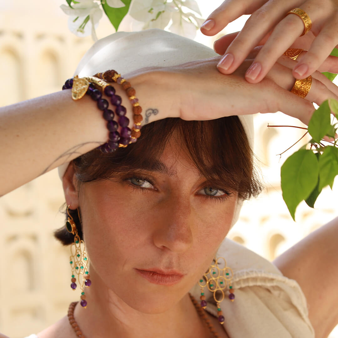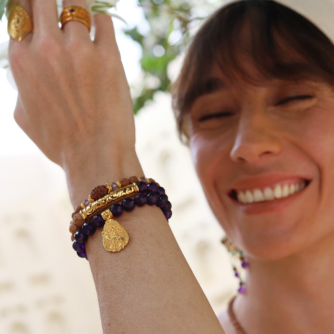 Are you drawn to the soothing energy of amethyst and seeking a deeper connection to your intuition? Discover the Visruti Healing Amethyst Bracelet, designed to support your journey of healing, spiritual awakening, and protection. This exquisite bracelet features amethyst beads known for their calming and protective properties, enhancing spiritual awareness and intuition. Paired with Rudraksha beads, which promote inner peace and connection to the divine, the Visruti bracelet offers a powerful blend of energies. The two ornate tube beads add an elegant touch, making this bracelet both a spiritual tool and a stunning accessory. Embrace the transformative power of amethyst and Rudraksha to elevate your spiritual practice and protect your energy.