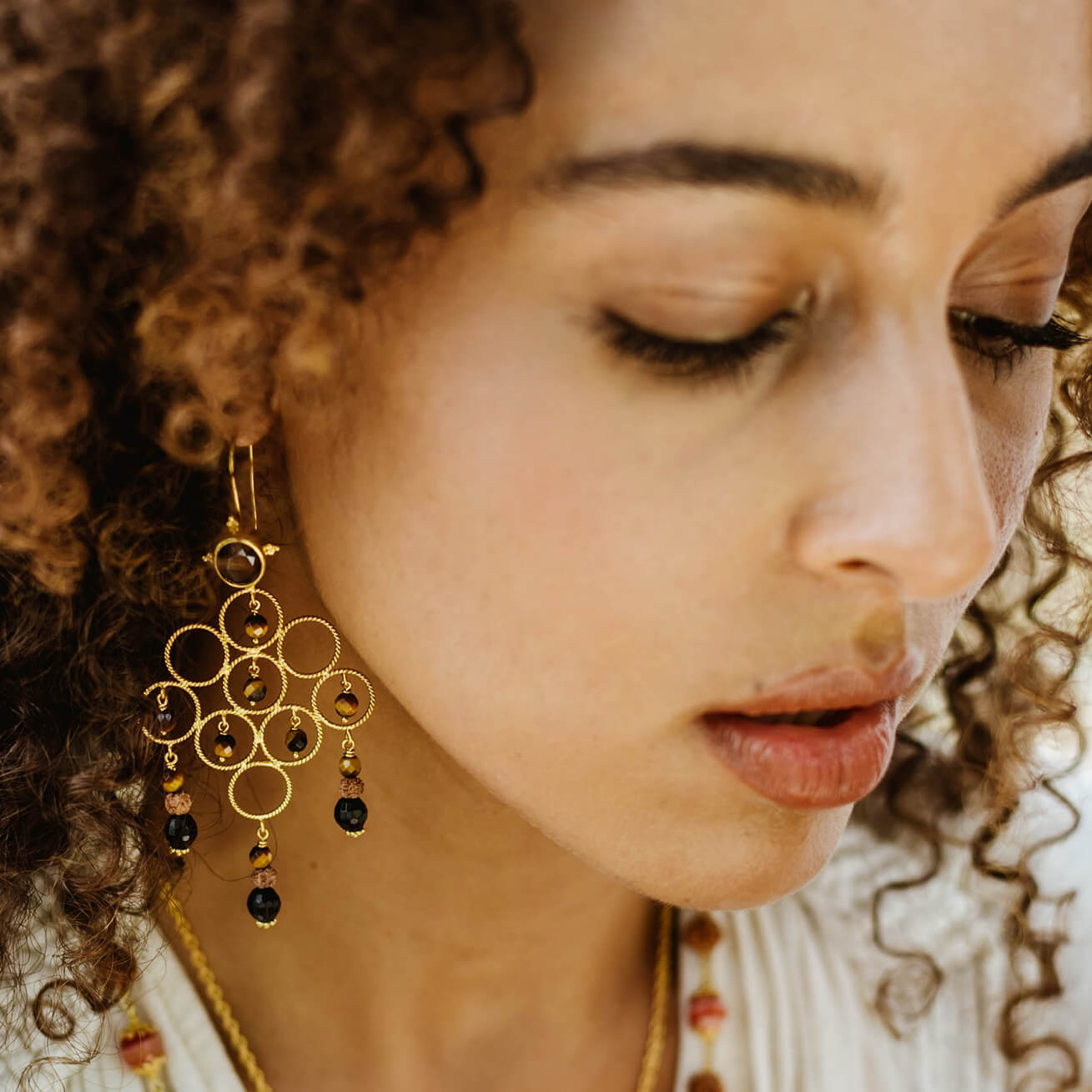 Unleash your inner strength with our Kali Mala Fearless Goddess Earrings, inspired by the mighty Goddess Kali, known for her fierce spirit and transformative power. These earrings are meticulously handcrafted using .925 silver wire and plated with 22 carat gold, offering you a touch of elegance and luxury. The exquisite design features 8 x 10mm faceted onyx gemstones, symbolizing Kali’s protective energy, and a beautiful dangling arrangement of 4mm sacred rudraksha, onyx, and faceted tiger eye beads, embodying courage, balance, and resilience. Fully activated and blessed, these Kali Maa Earrings are more than just a piece of jewelry – they serve as a conduit to channel the Divine Mother’s power, infusing your life with greater confidence, competence, peace of mind, and balance.