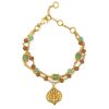 4 mm sacred rudraksha, 6mm faceted aventurine, 22k gold vermeil Durga/Parvati pendant, 22k gold vermeil chain wire and chain with a lobster claw clasp.