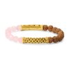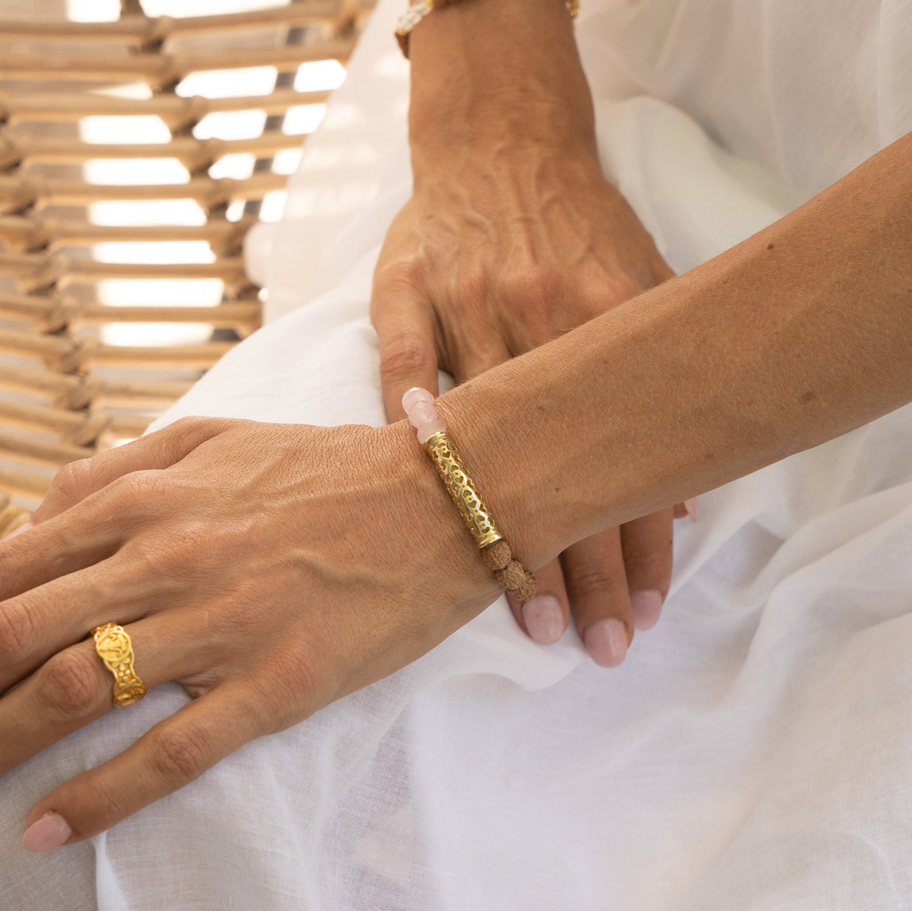 Introducing our bestselling Lavanya bracelet – a beautiful energy token that celebrates love and friendship. Combining authentic and activated sacred rudraksha with the gentle vibrations of rose quartz, it functions as a powerful and healing sacred power object, acting as a love medicine for the heart, opening and protecting it, and serving to attract support and confer healing energy. Handmade in Bali, the bracelet features two ornate, handmade tube spacers decorated with a shower of hearts and engraved with the simple yet transformational words: “Love, Always”. Whether given as a gift of friendship or love or to affirm self-love, it connects to the heart chakra to strengthen that heart connection. Embrace your loved ones, and yourself, by gifting or wearing this love bracelet!