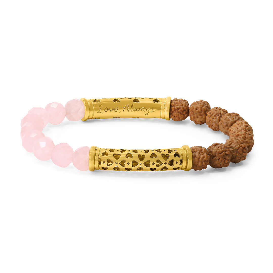 8mm sacred rudraksha, 8mm faceted rose quartz, ornate tube brass spacers stamped with hearts and engraved with the words ”Love, Always”, strung on elastic thread