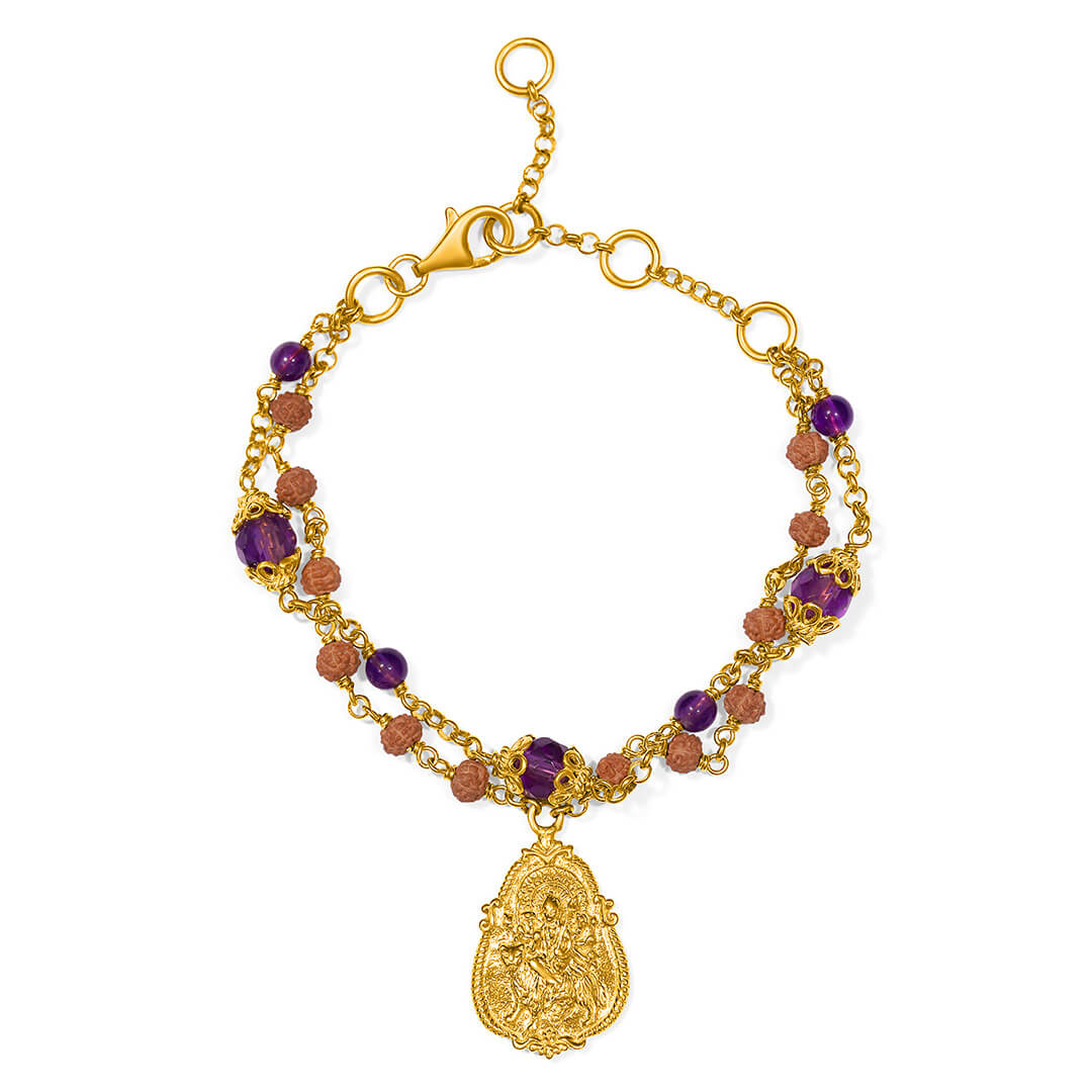 4 mm sacred rudraksha, 6mm faceted amethyst, 22k gold vermeil Durga/Parvati pendant, 22k gold vermeil chain wire and chain with a lobster claw clasp.