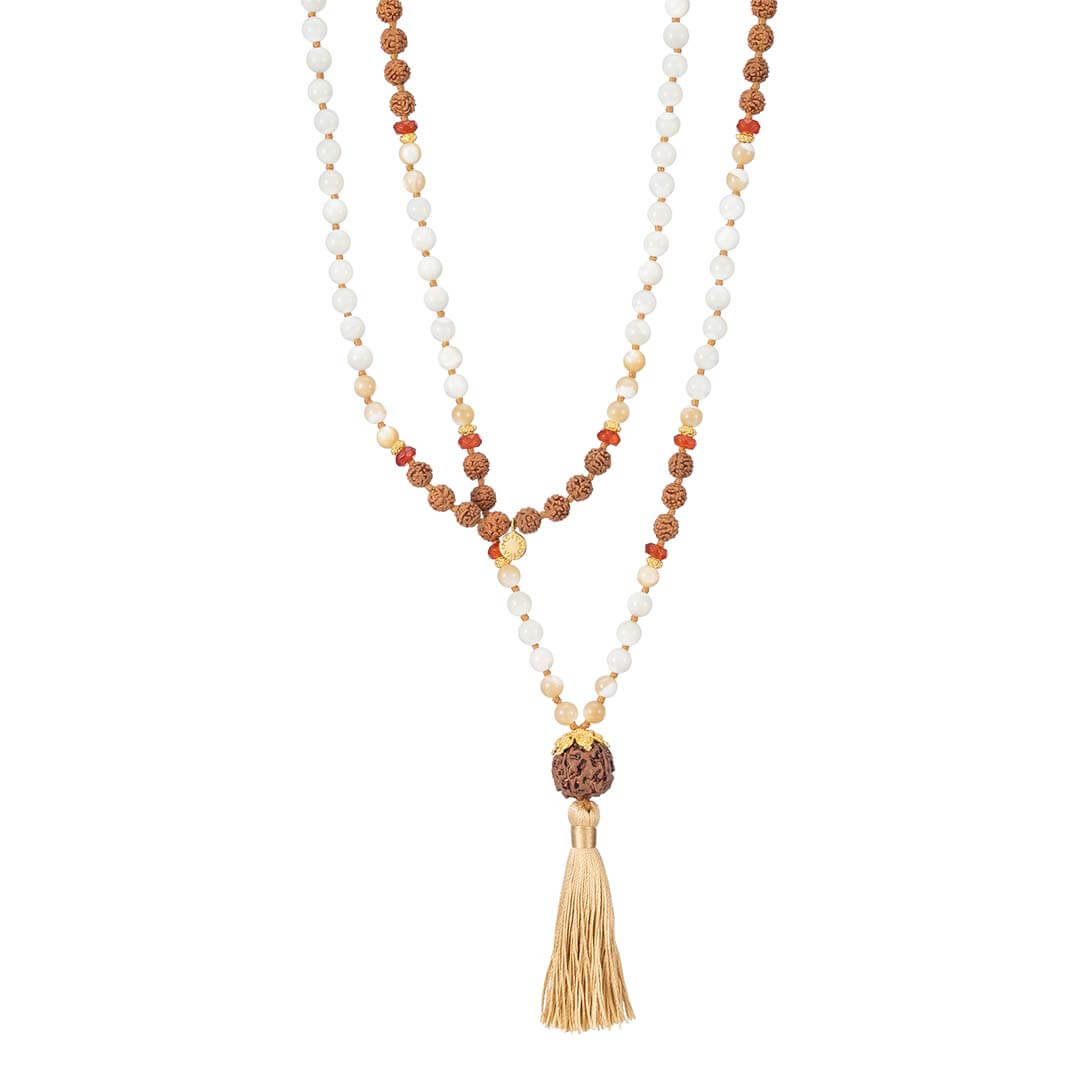 The Peaceful & Balanced Samudra Mala has 108 beads + a powerful 5 Mukhi Power Rudraksha as pendant Sacred ingredients: 6mm sacred rudraksha, seashell beads, faceted carnelian, 5 Mukhi power rudraksha,, 22k gold vermeil component, strung on silk Mala length: approx 37”/94cm Tassel: 2.5cm Available in 14k, 18k or 22k gold upon request as custom order THE GURU PENDANT BEAD The pendant bead of your meditation mala represents the guru. Gu-Ru means that which leads from darkness to light, from ignorance to wisdom. As this bead has a special meaning, we have amplified the power of this mala with a powerful 5 Mukhi Power Rudraksha bead.