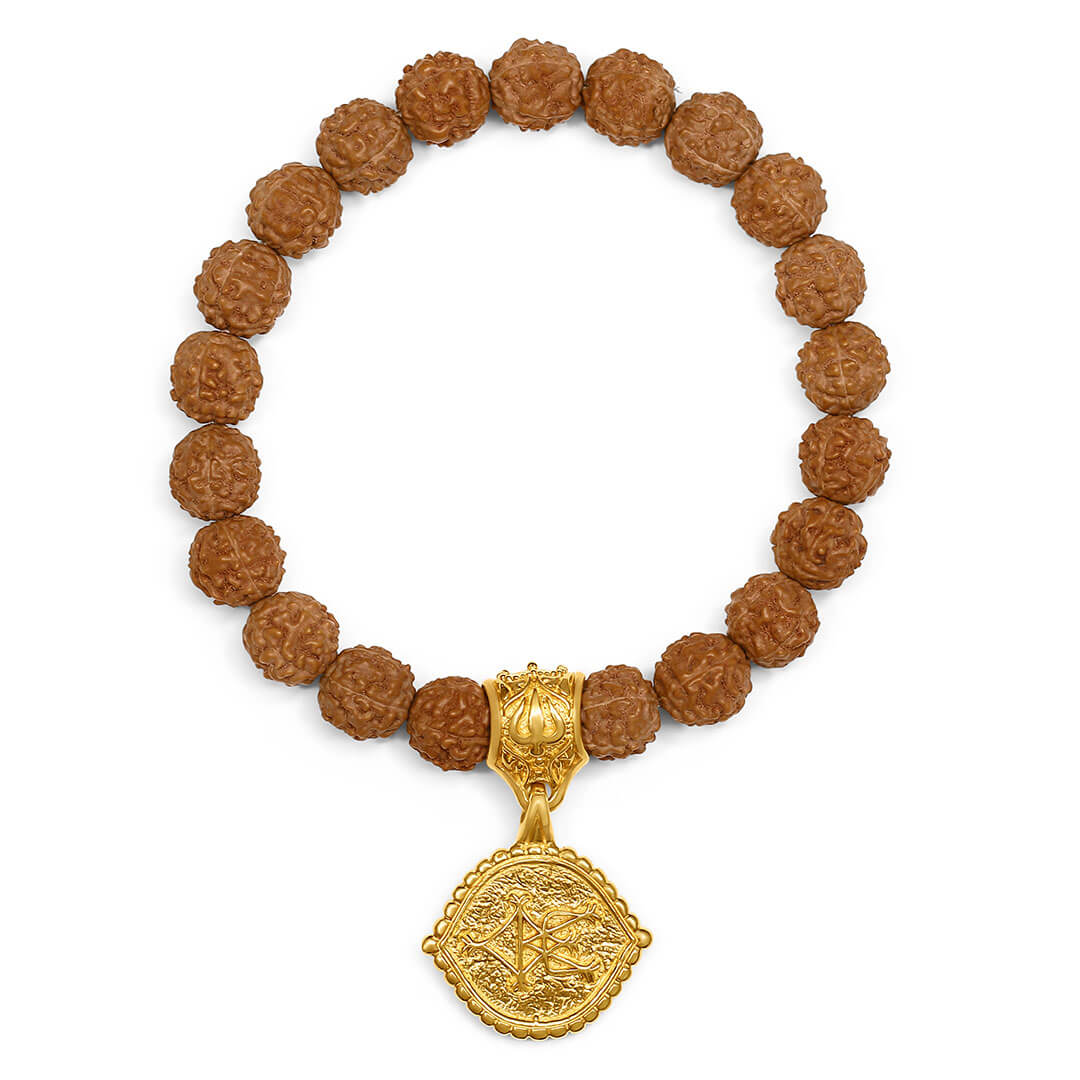 This powerful accessory includes 8 mm genuine Rudraksha beads, intricately placed between .925 silver or 22k gold-plated brass spacer bead and pendant, all strung on a durable elastic thread.